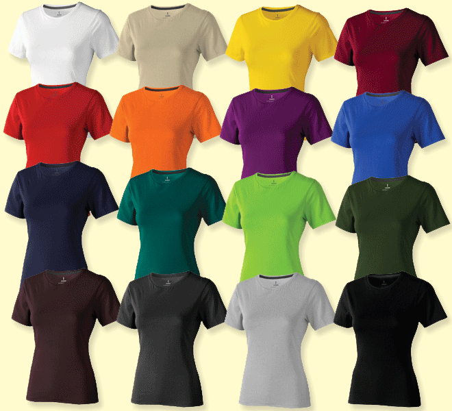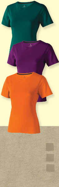 Elevate Ladies' Nanaimo T-Shirt is made from ringspun combed cotton of 160GSM. Side seams with 1 x 1 rib collar without stitching on the outside. Chain stitching. Tonal print on back. Pre-shrunk with satin shoulder to shoulder tape. Smooth surface gives great enhancemnet of printed image. Soft feel to the skin. Available in: white. beige, yellow, burgundy, orange, plum, blue, navy, forest green, apple green, army green, brown, anthracite, grey melange, black. Print areas: Back/Centre: 380 x 360mm. breast: 120 x 120mm. front centre: 380 x 360mm. Embroidery prices are example for t-shirt with logo of 5,000 stitches - approx 24sq cm. up to 12 colours Screen printed prices are for t-shirts printed 1 colour in 1 position and include flash curing and origination for coloured t-shrts. Please call for multi-colour print prices and transfer printing options Origination: £29.00 per colour per position. |