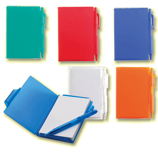 Notebook 12736. Promotional Notebook with 80 sheet pad in hard plastic case and matching colour black ink ballpoint. Overall size: 10.5 x 8 x 1cm. Print area: 40 x 40mm. Please call for ballpoint pen printing options. Available in white, orange, red, blue or green.