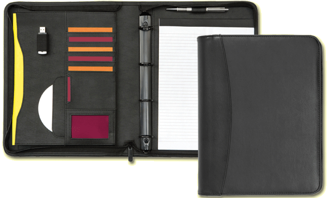The Pembury A4 4 Ring Zipfolio is made from quality padded PU. This gives a stylish 2 tone cover. These promotional zipped 4 ring conference folders have a stylish 2 tone cover along with a good selection of functional sections. Overall size: 35 x 27 x 4.5cm. Print area: 13 x 14cm on front centre. Printed prices shown are for a 1 colour screen in 1 position.Please call for all other printed options such as foil blocking, blind embossing or UV print. All folders are supplied with 20 page recycled notepad. Any accessories shown are for illustrative purposes only. |